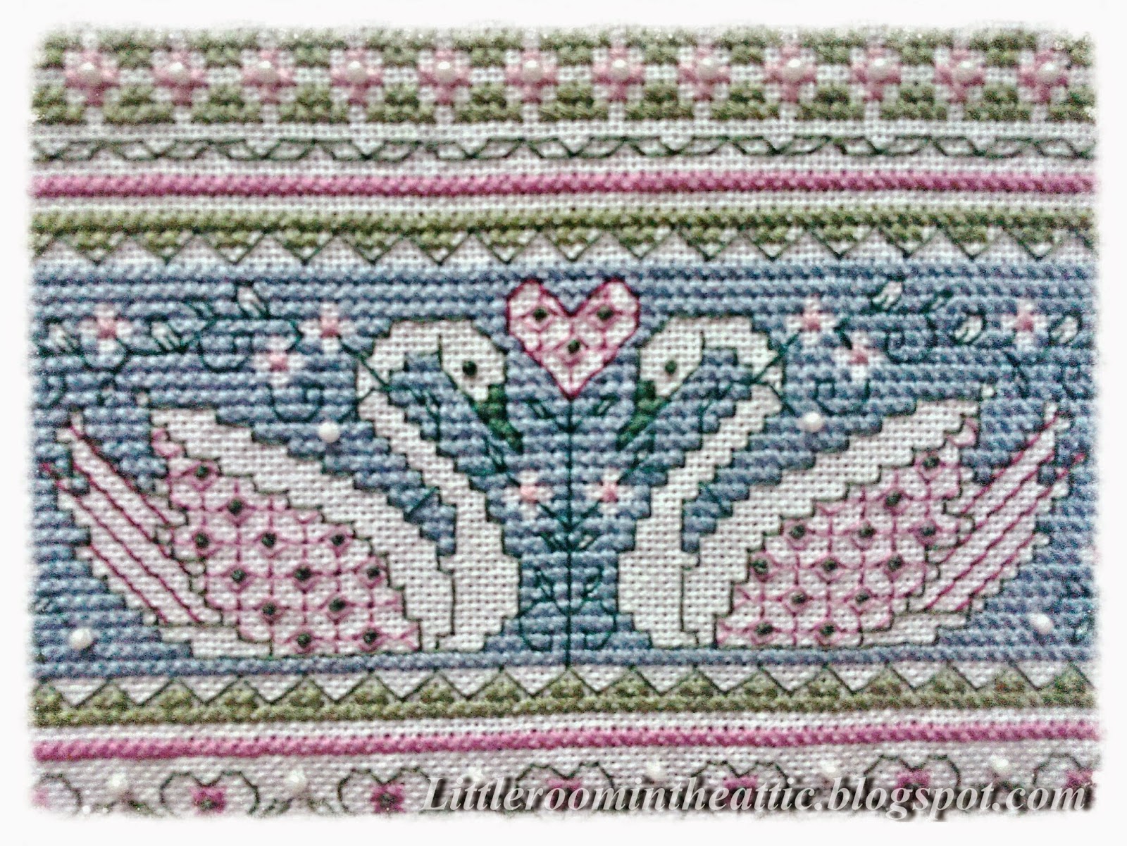 Схема взята из журнала CrossStitcher #214 ("Eternally yours" - "Навечно твой/твоя"). Вышивала на белой канве Linda 27 нитками DMC и бисером Mill Hill по ключу (если кто соберется шить этот дизайн, берите два мотка 932 цвета).